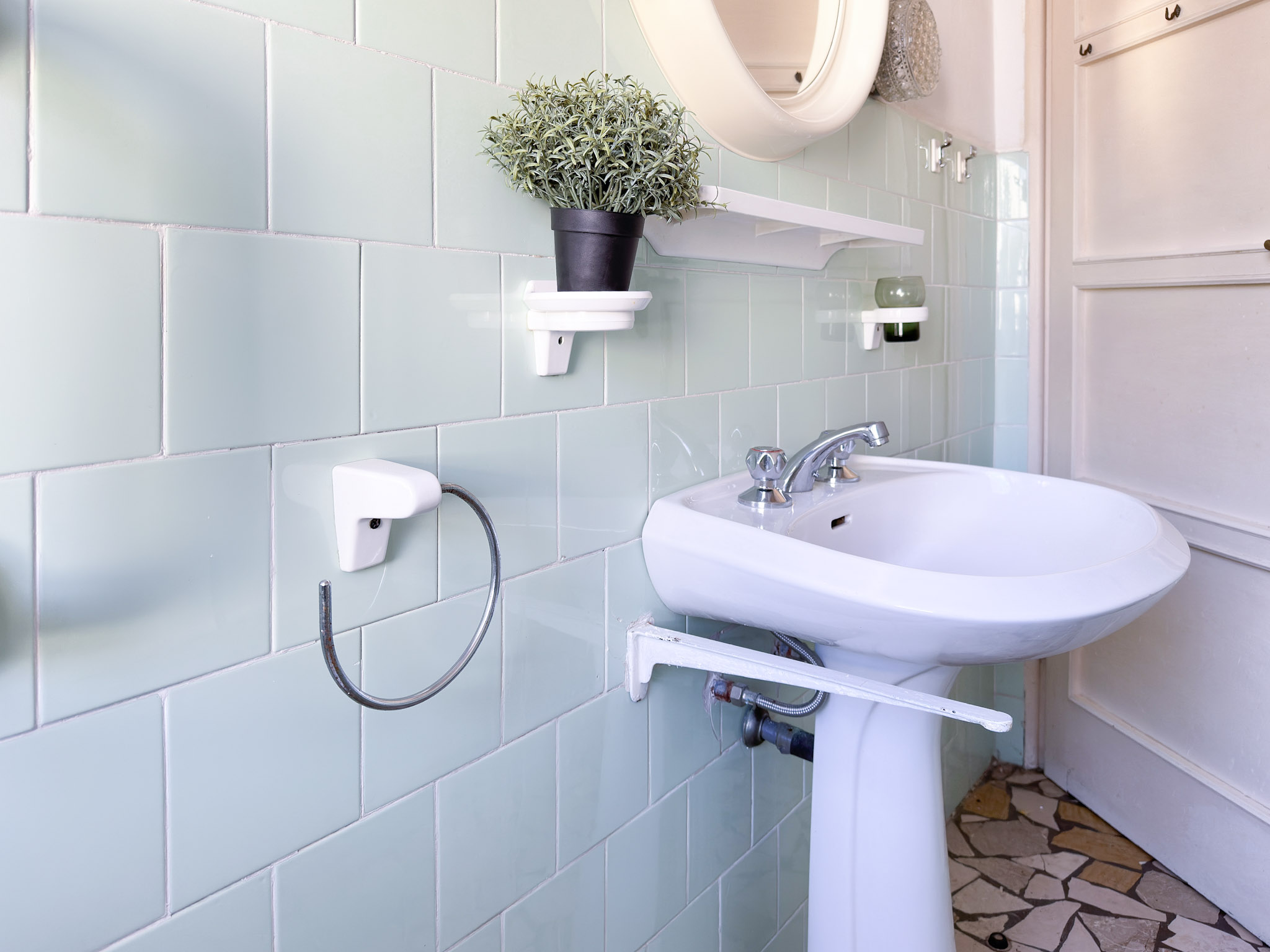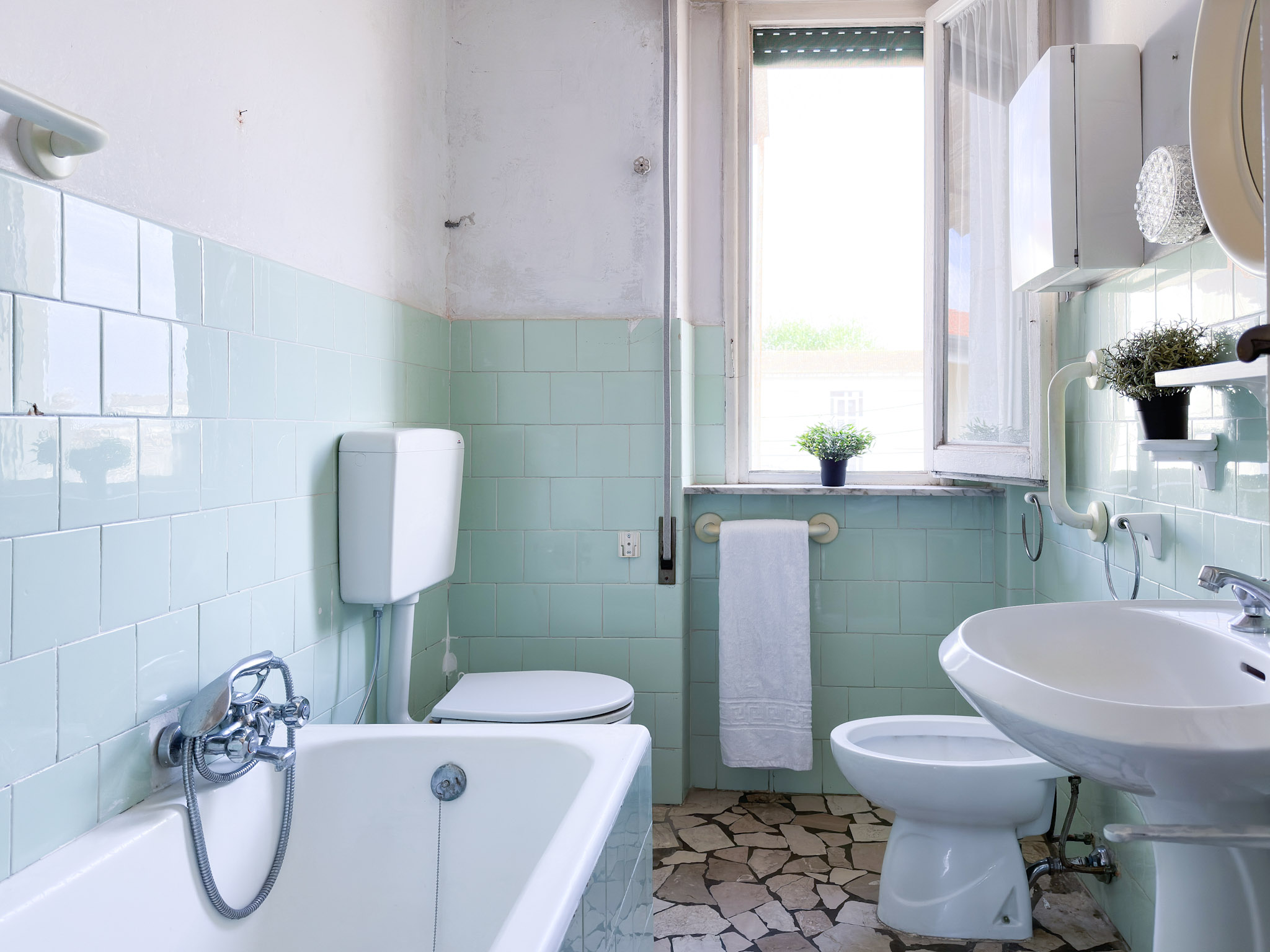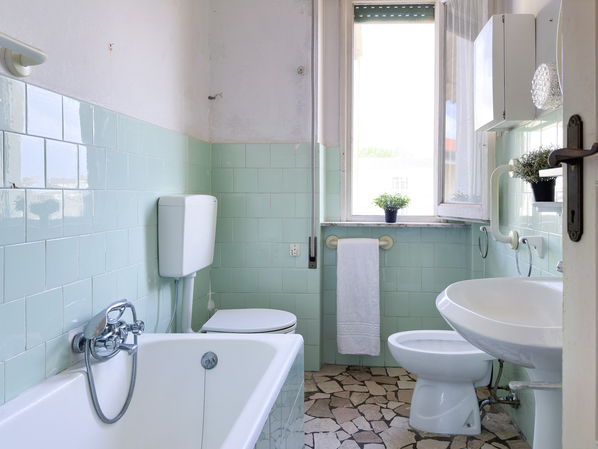 Bagno da rivedere, attualmente dotato di vasca stile anni ’60, pronto a trasformarsi in un’oasi moderna e funzionale.