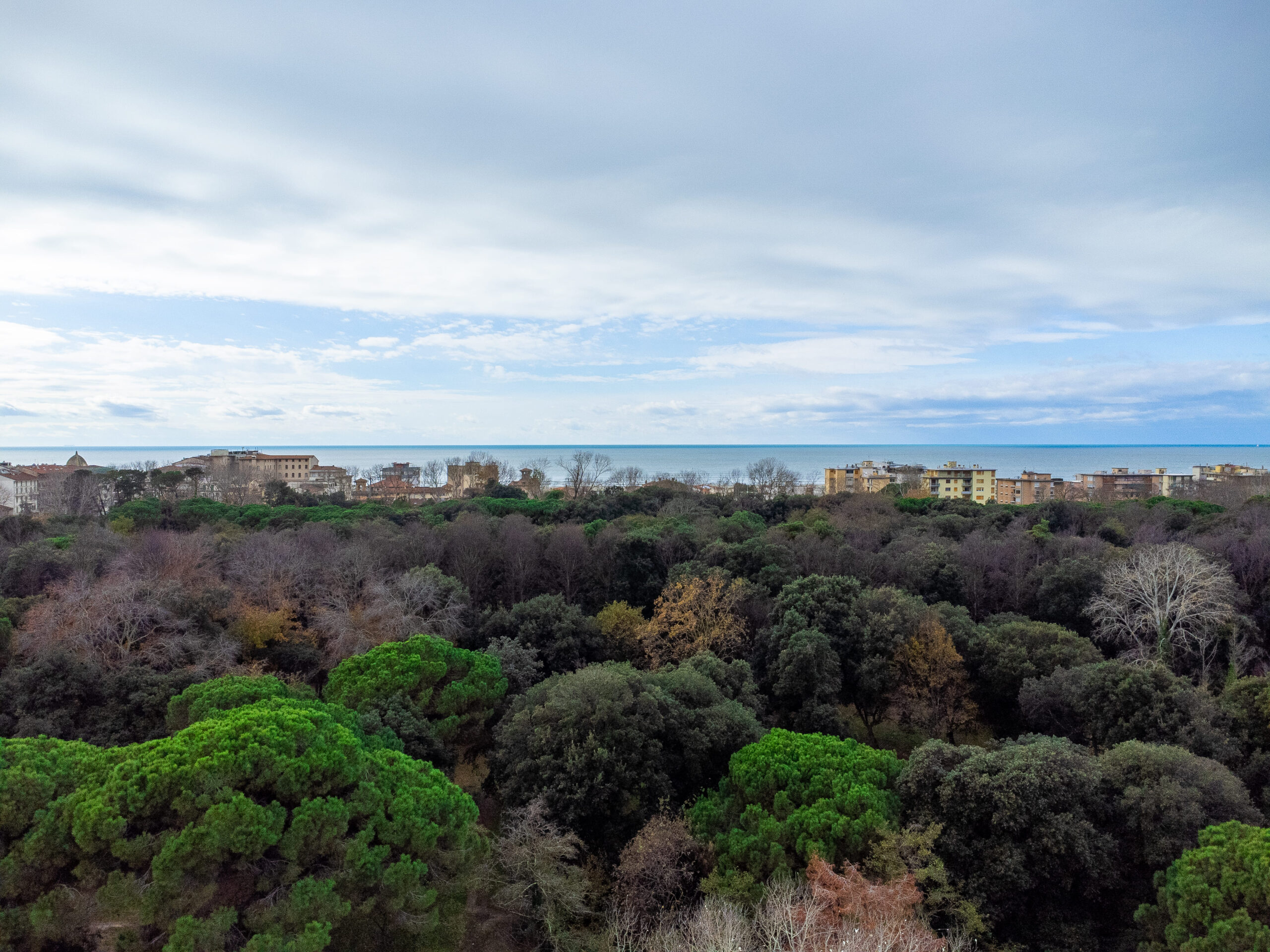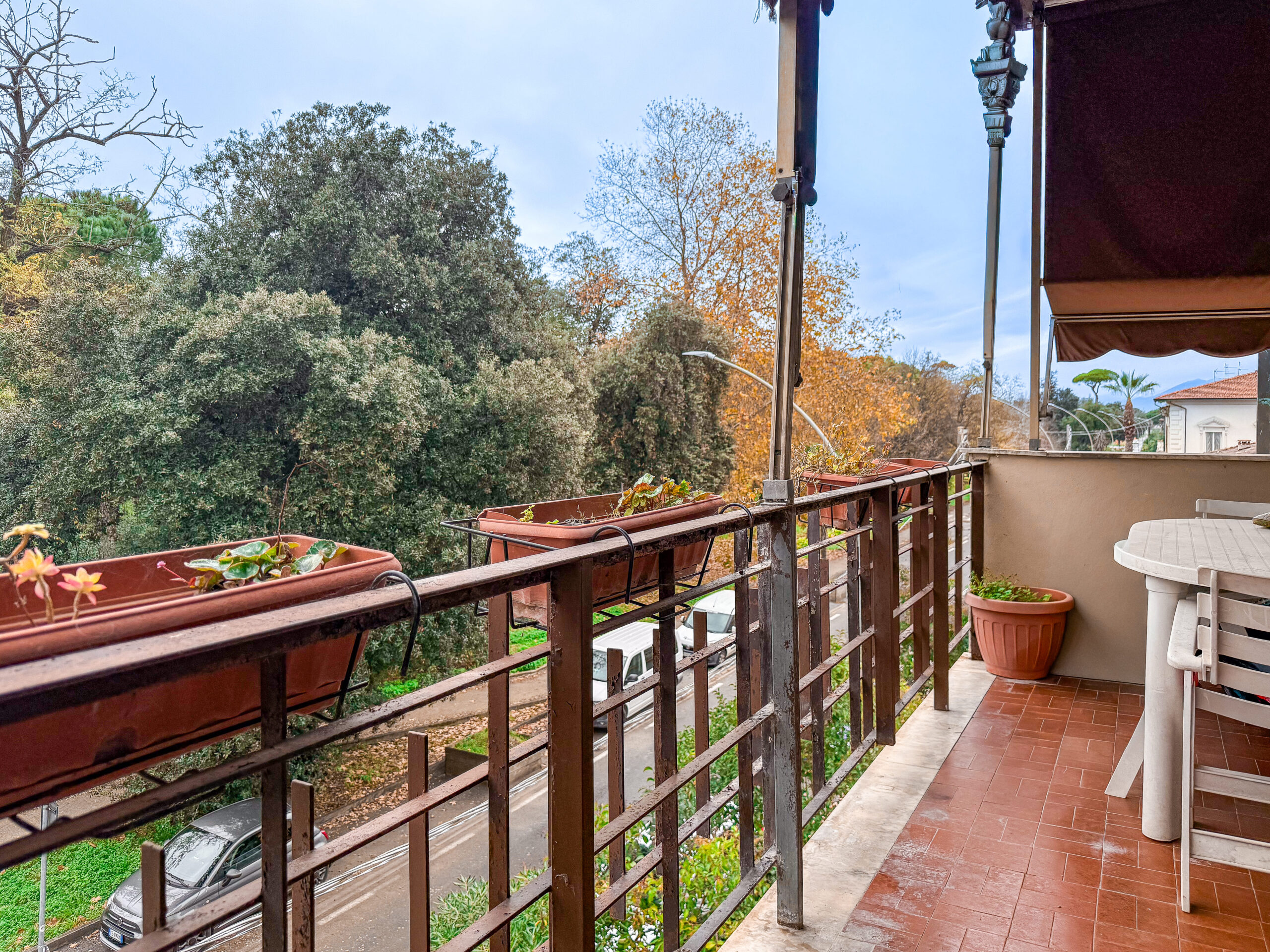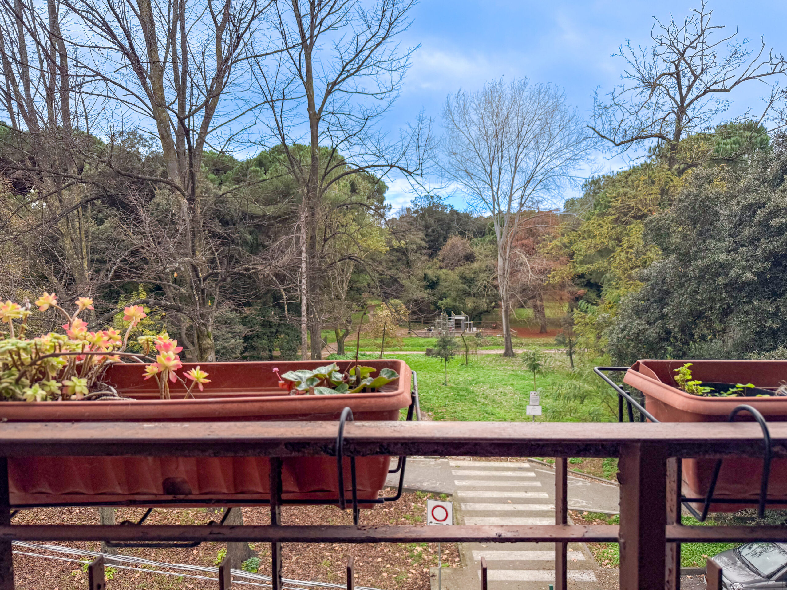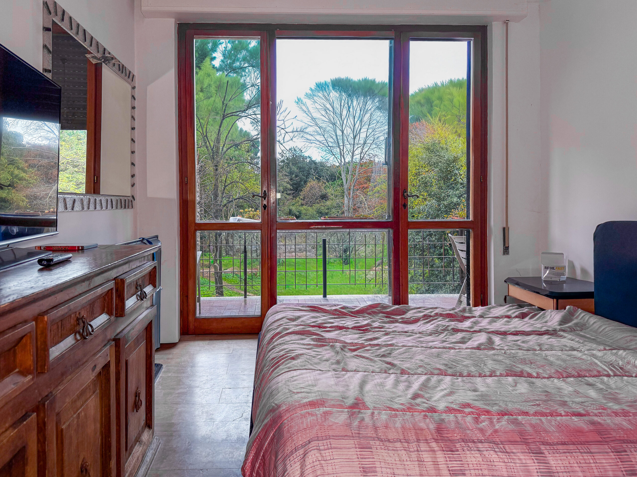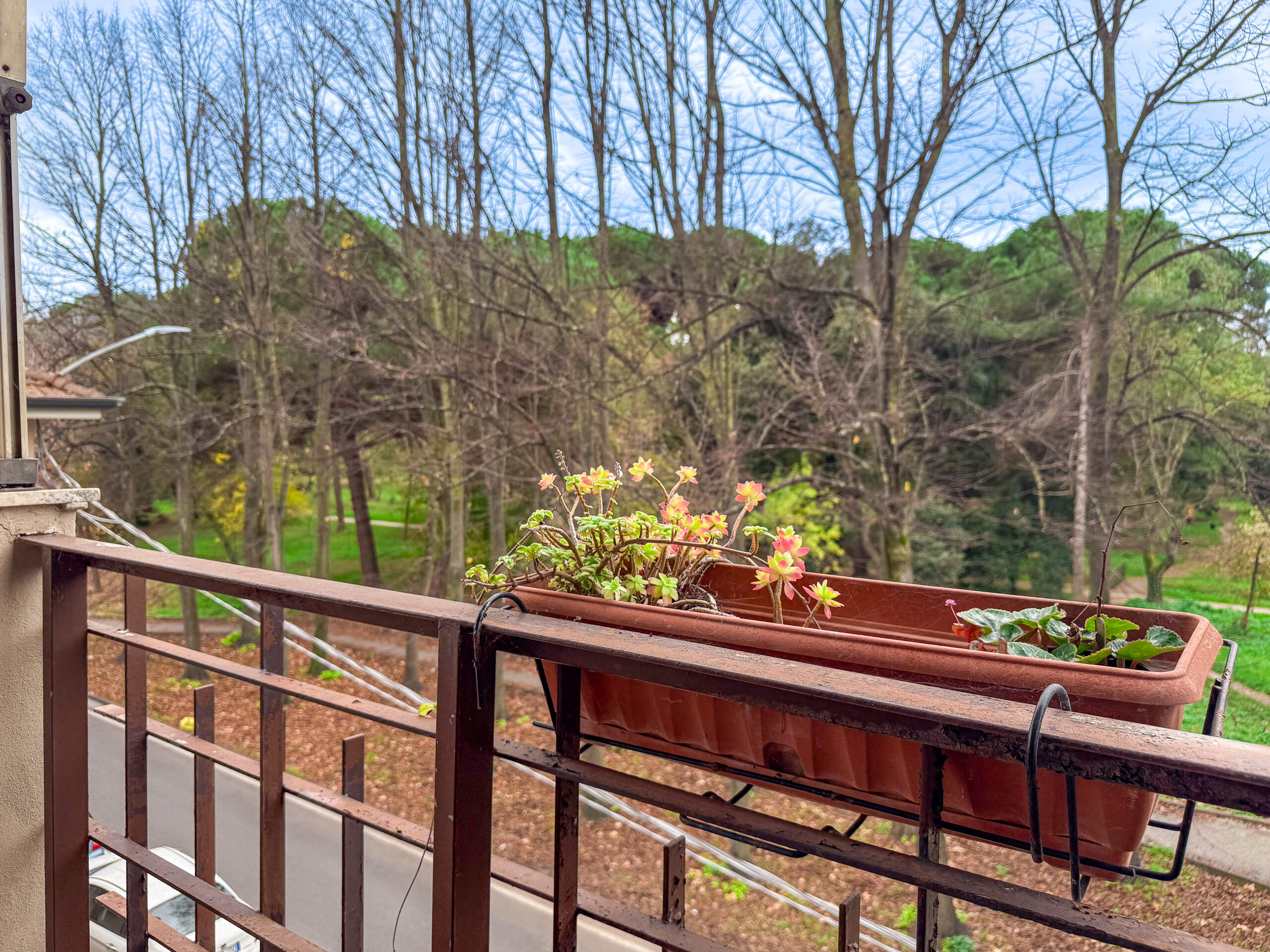 I due balconi sono la parte più preziosa: quello principale si affaccia direttamente sulla Pineta, regalando una vista verde che cambia con le stagioni, una luce delicata, un silenzio che sorprende ogni volta.