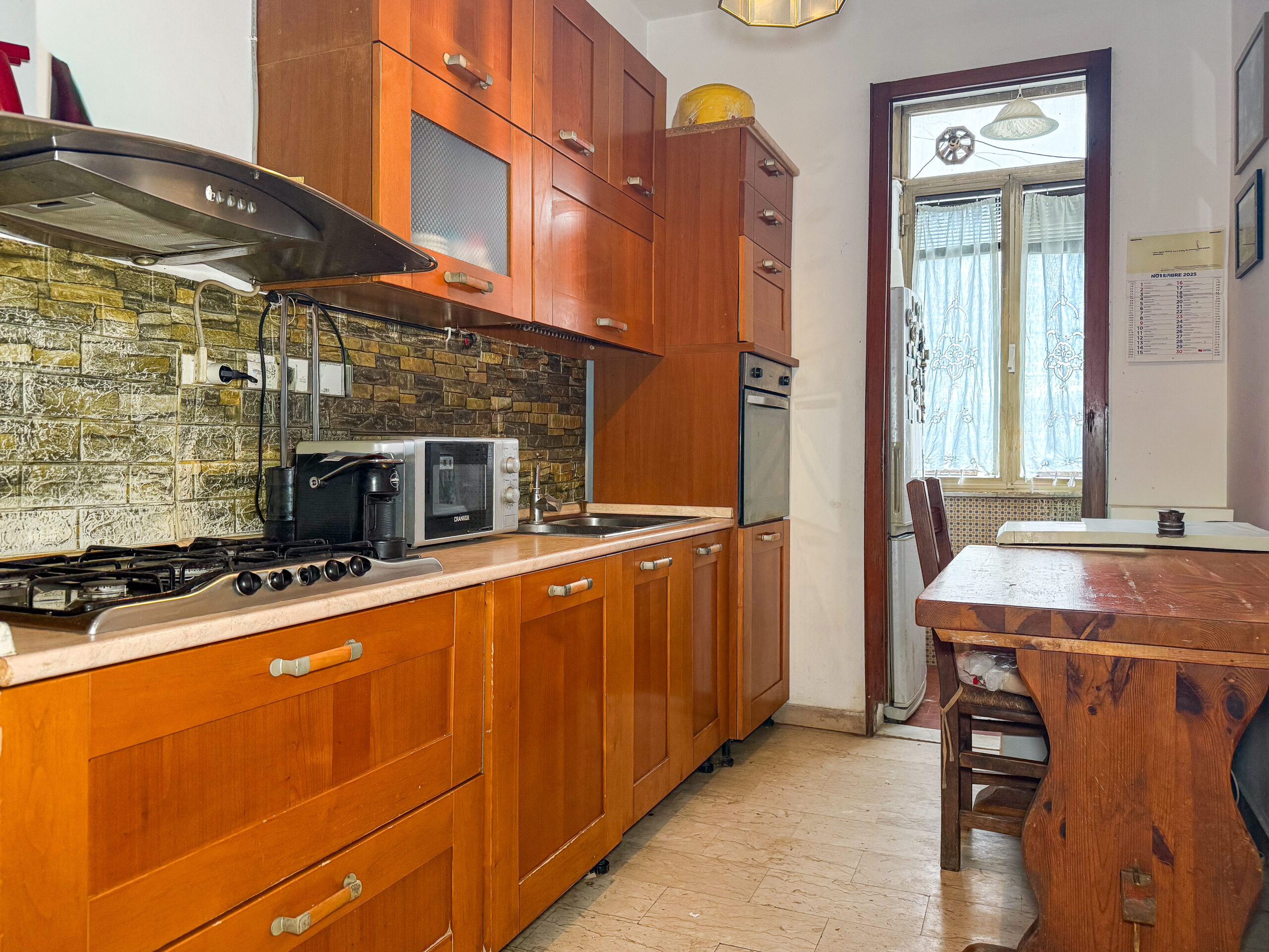 La distribuzione interna, chiara e funzionale, richiama la qualità degli spazi degli anni migliori: un ingresso che accompagna verso la sala, un cucinotto separato, un comodo ripostiglio, tre camere ben divise: la matrimoniale, la camera media e la cameretta, oltre a bagno e wc di servizio. .