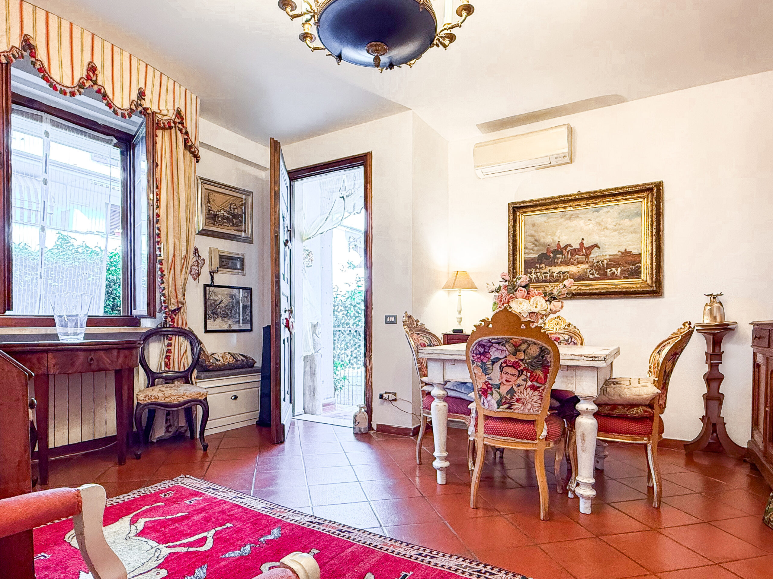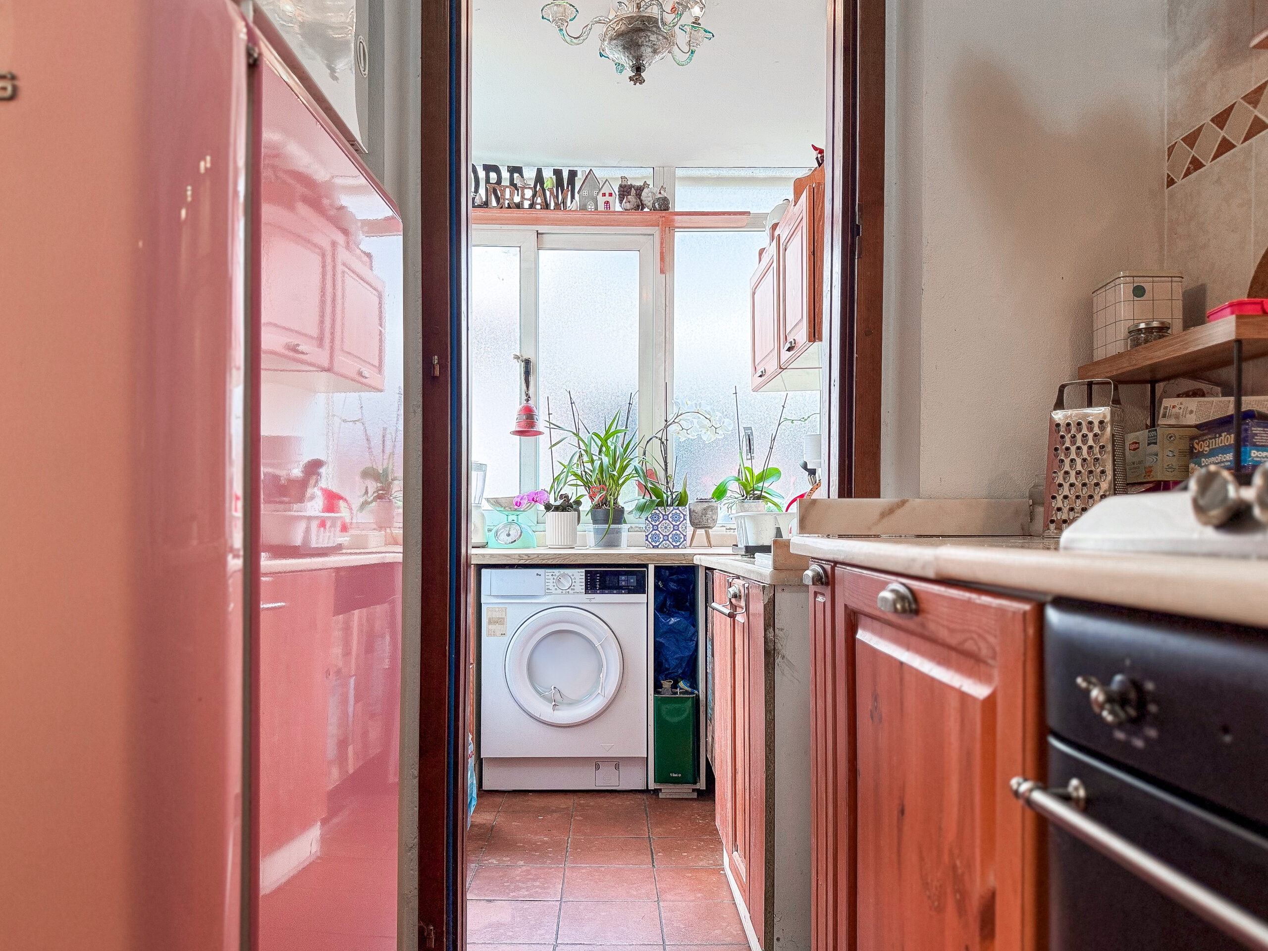 Un salone che si apre alla luce naturale, una cucina comoda e organizzata, e un bagno di servizio con piccola doccia.