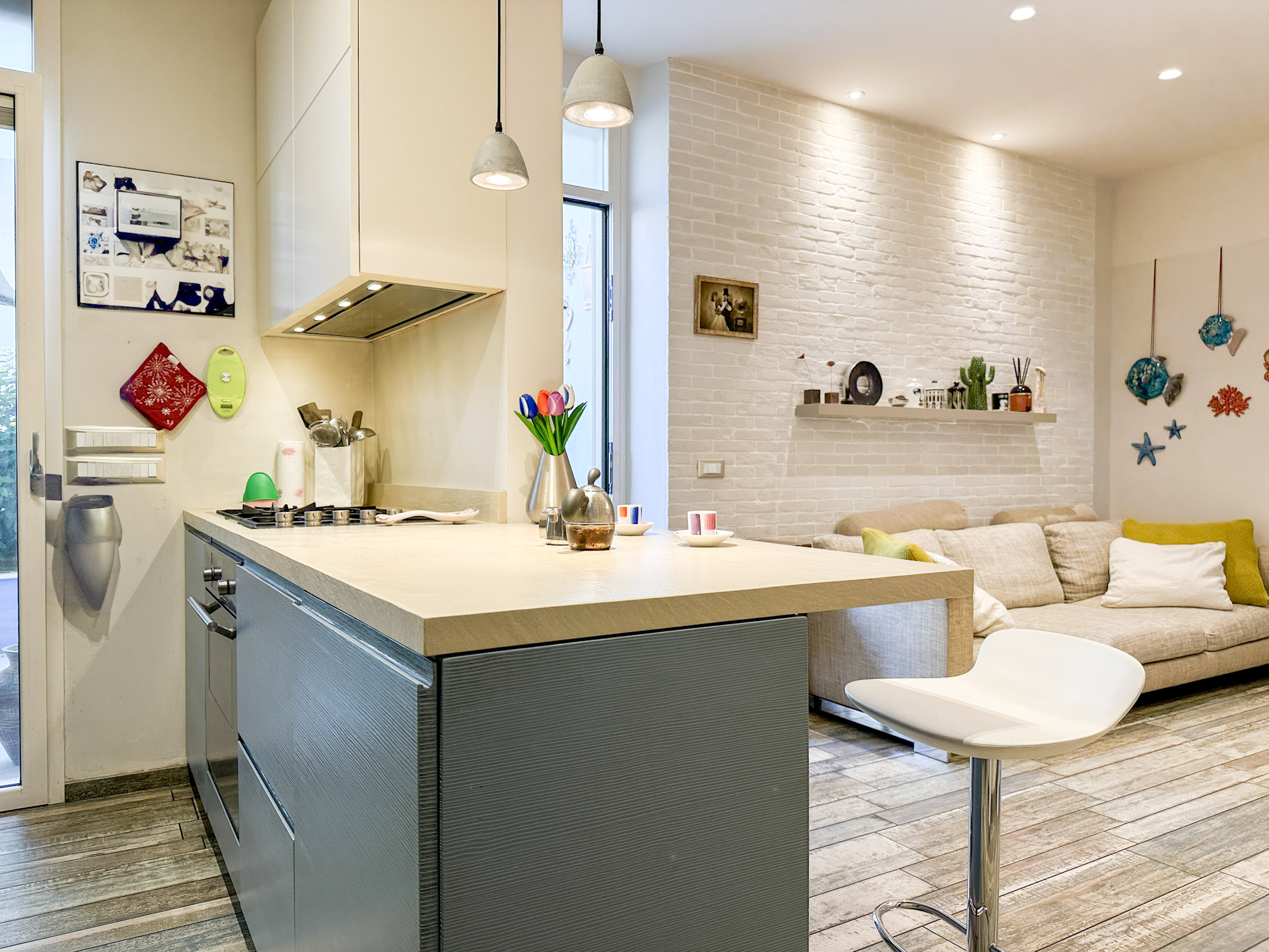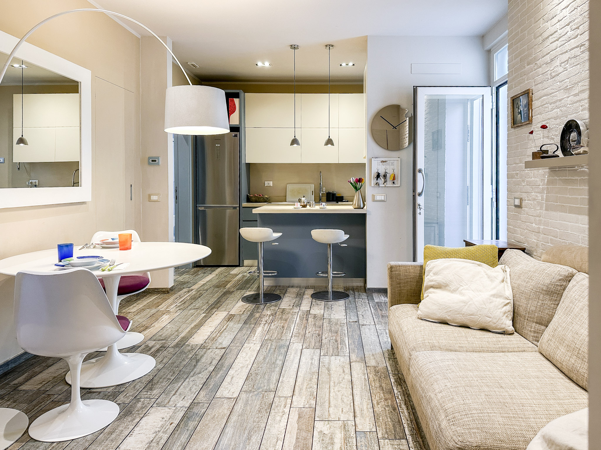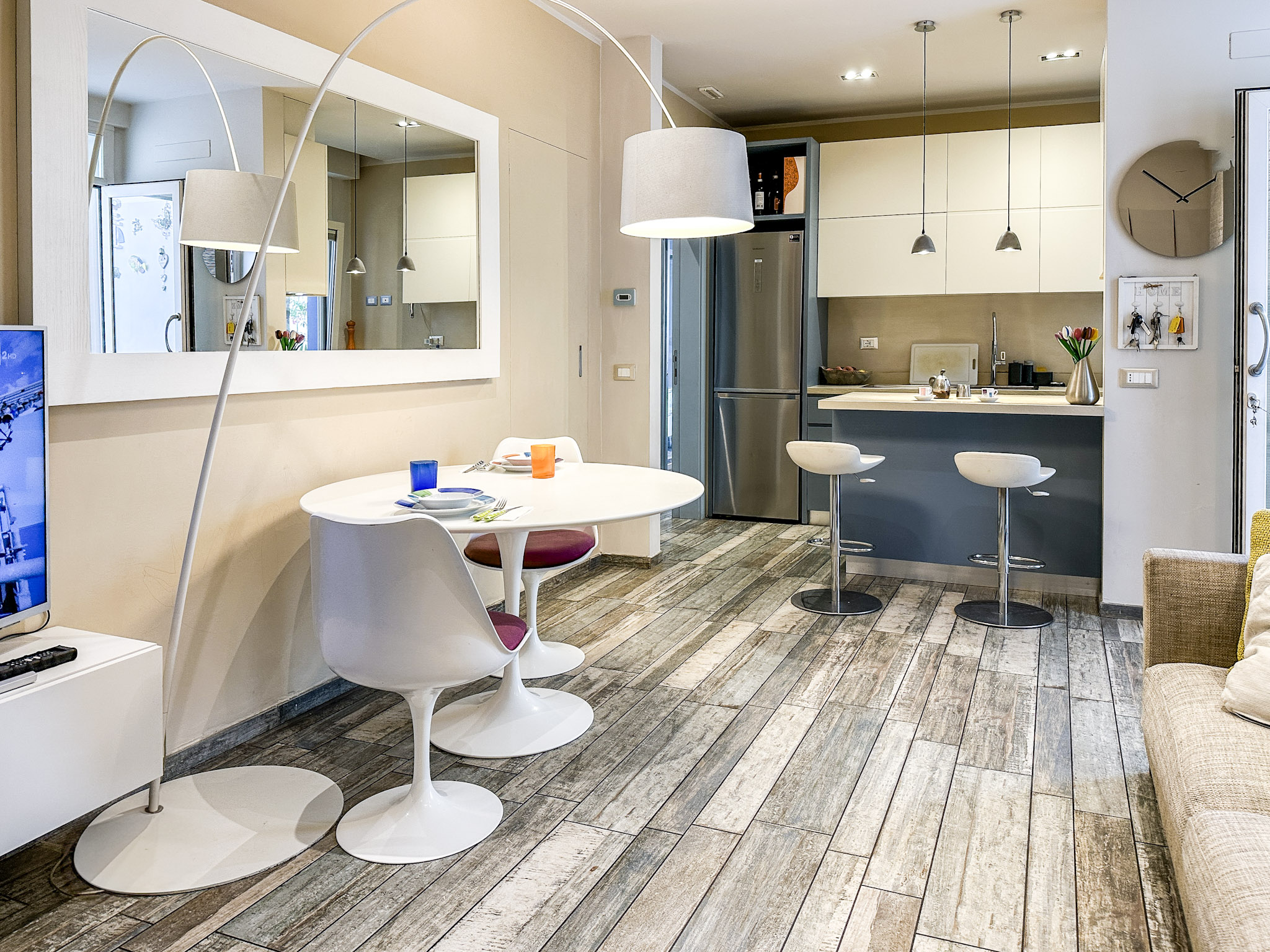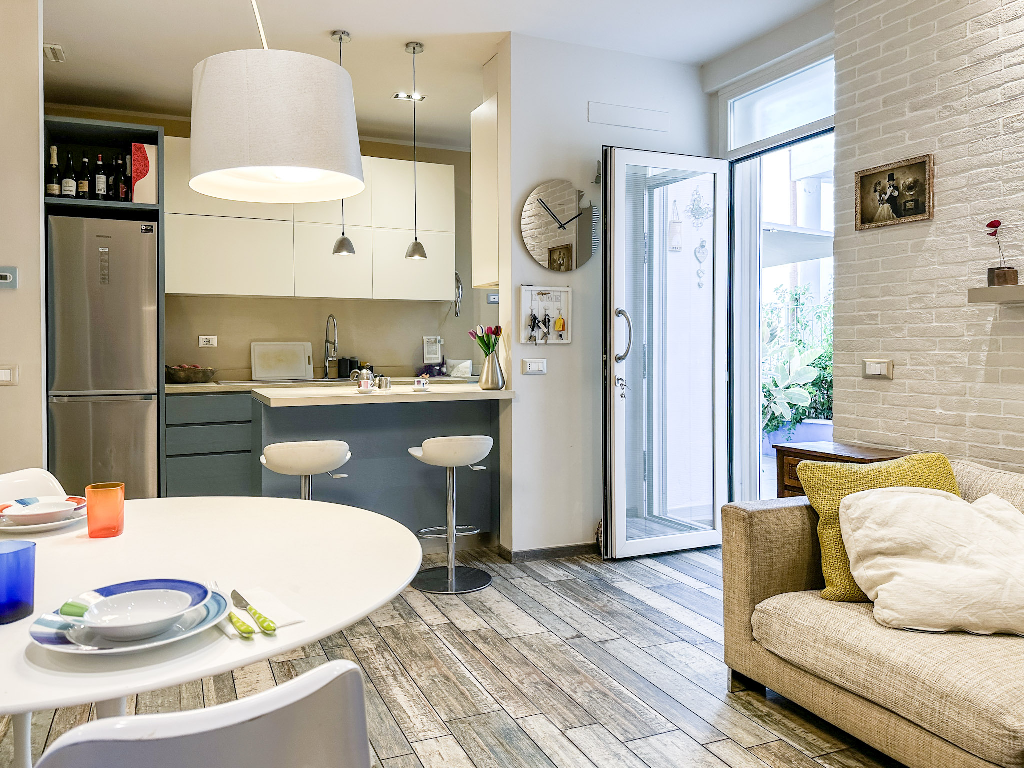 • Illuminazione: L’appartamento è dotato di un sistema di illuminazione LED integrato, con faretti nel soffitto che offrono una luce calda e accogliente. Le luci a sospensione sopra l’angolo cottura e il tavolo da pranzo aggiungono un tocco moderno e sofisticato.