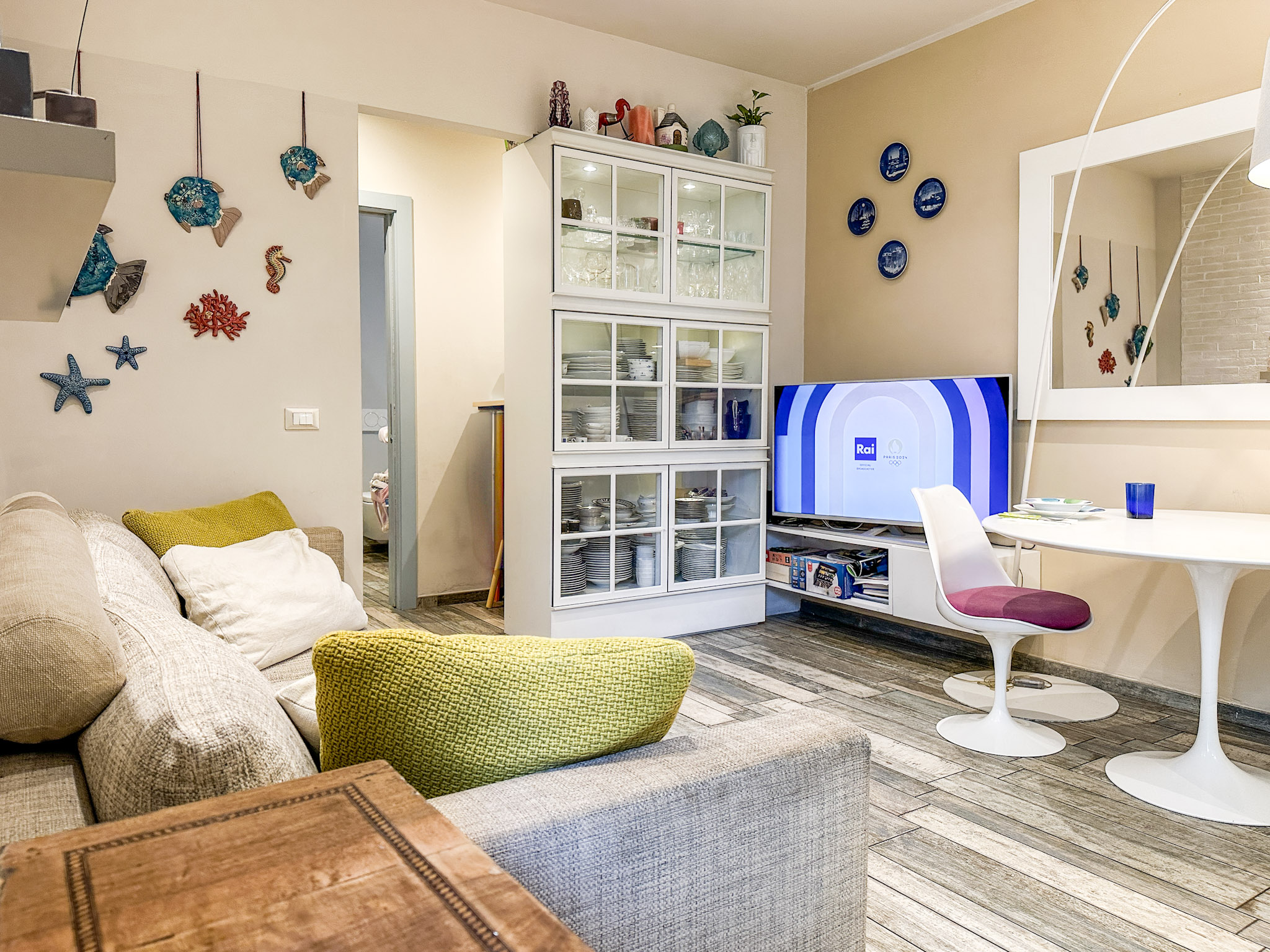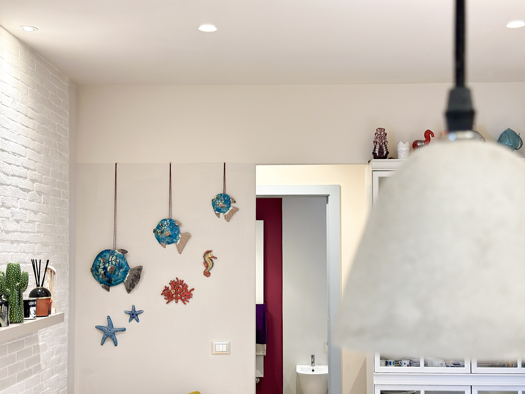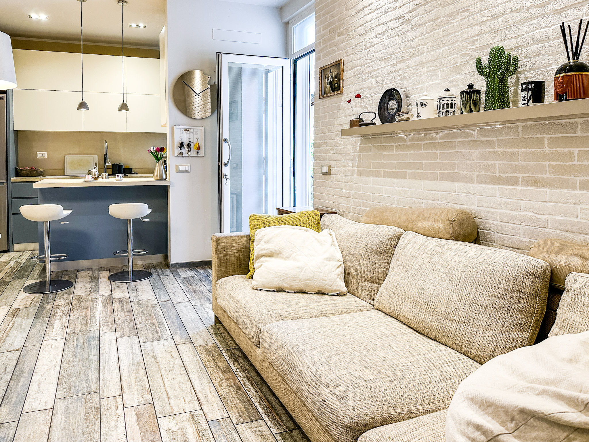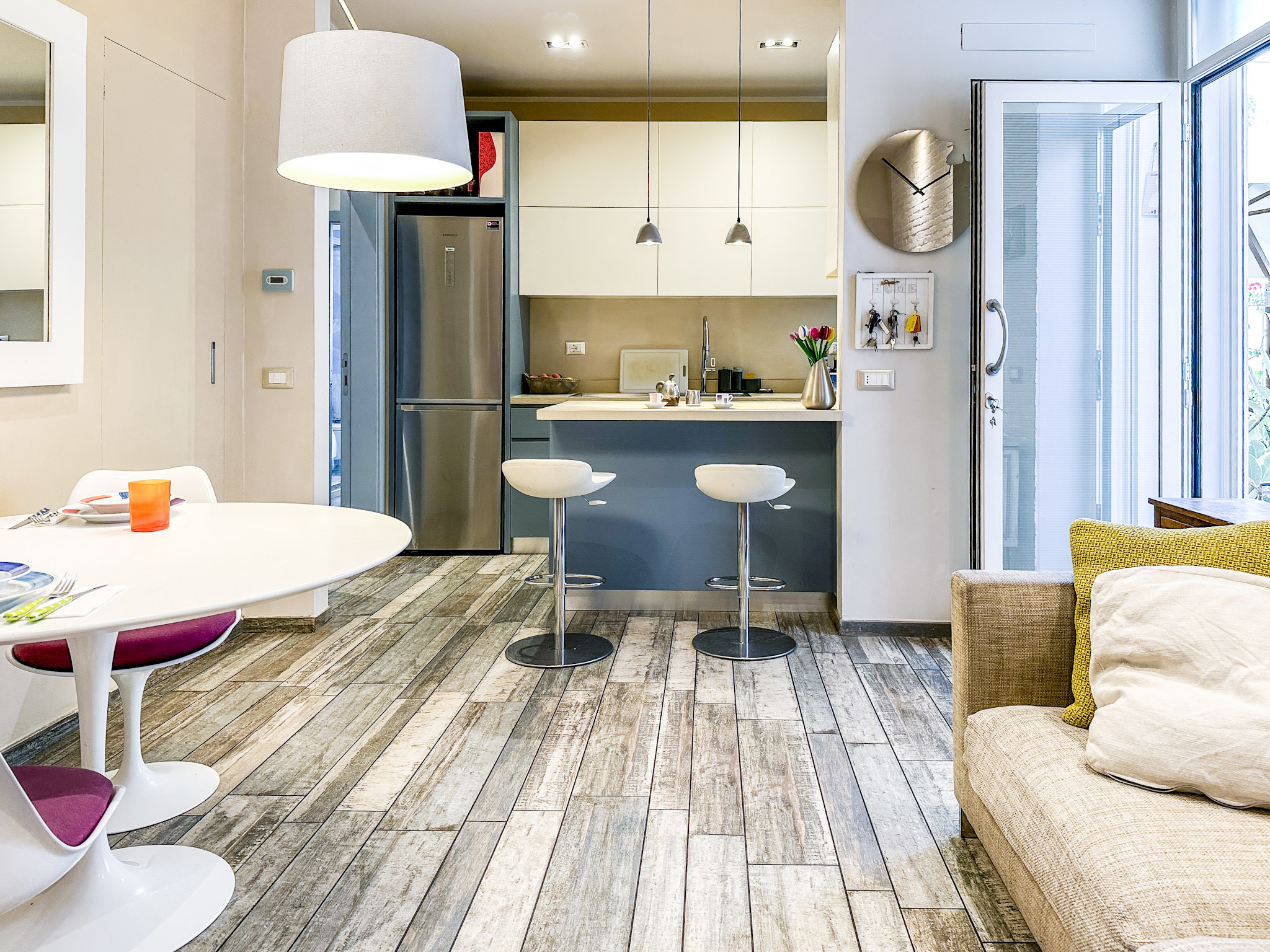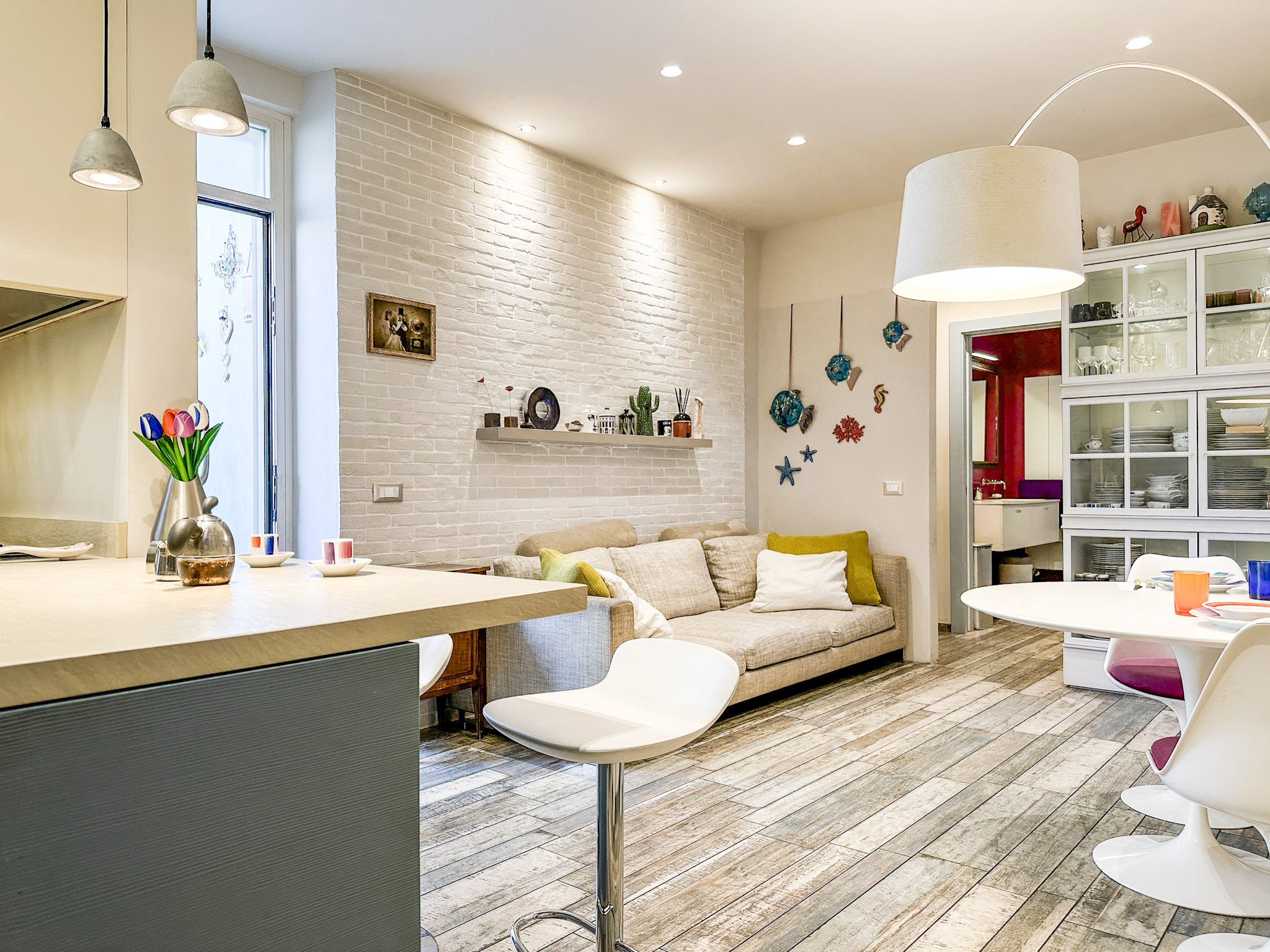 • Illuminazione: L’appartamento è dotato di un sistema di illuminazione LED integrato, con faretti nel soffitto che offrono una luce calda e accogliente. Le luci a sospensione sopra l’angolo cottura e il tavolo da pranzo aggiungono un tocco moderno e sofisticato.