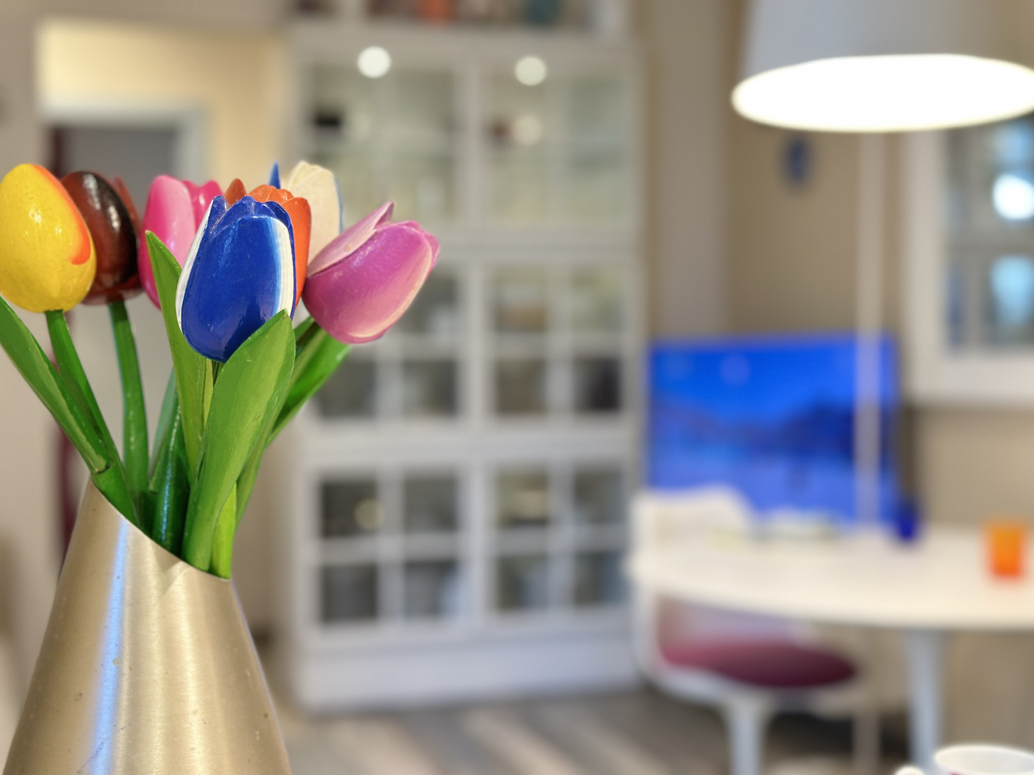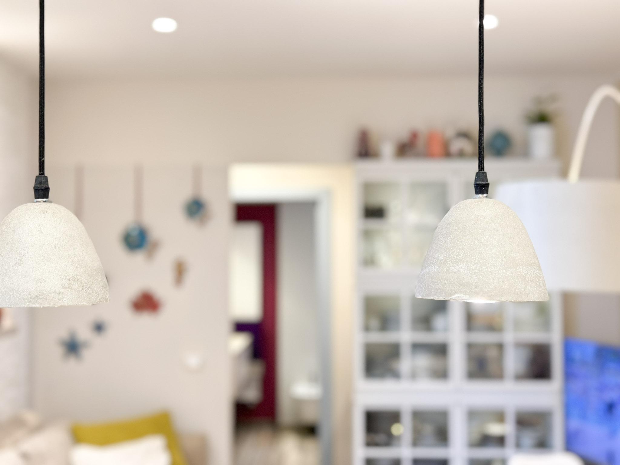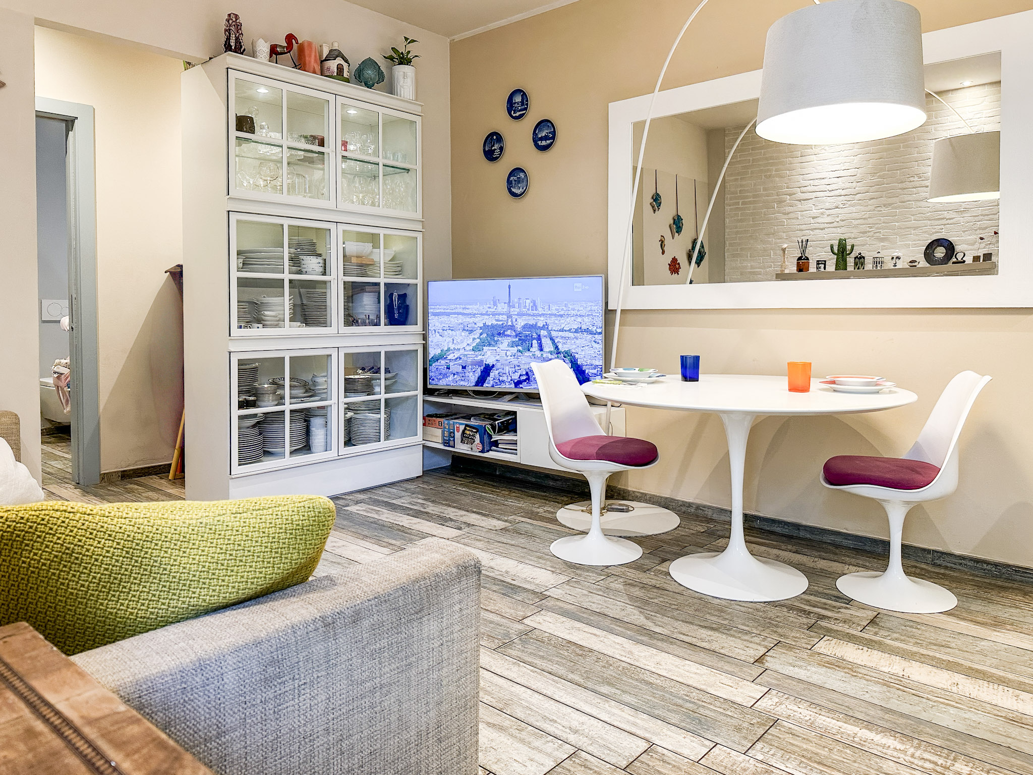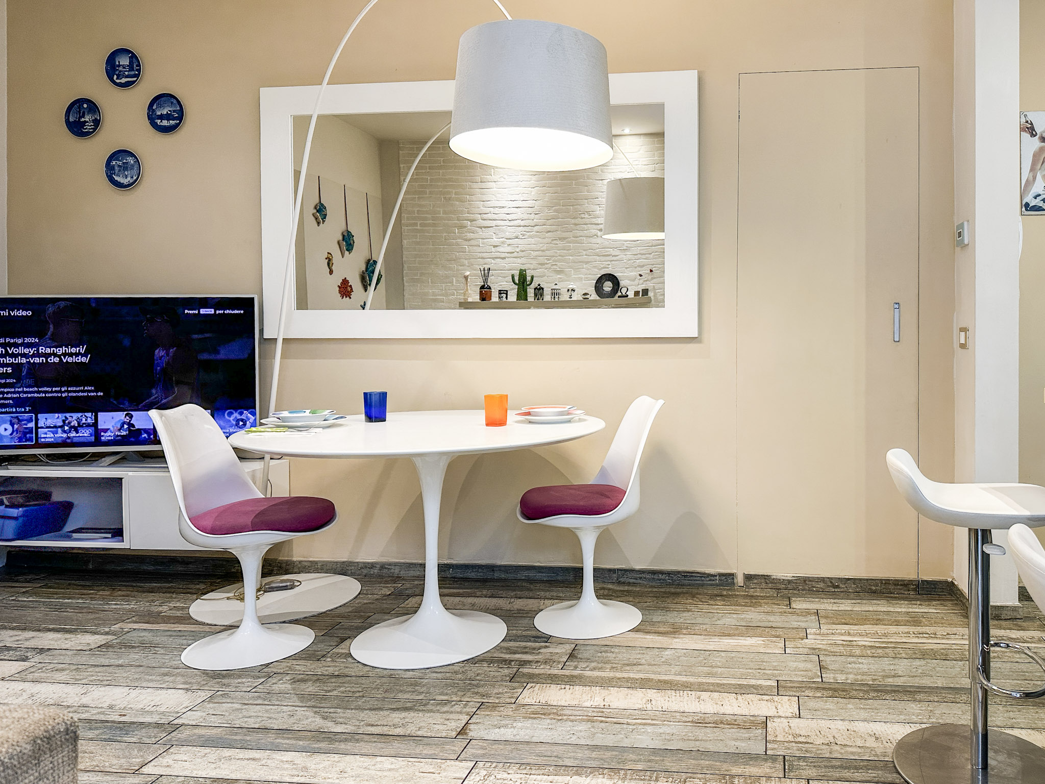 • Illuminazione: L’appartamento è dotato di un sistema di illuminazione LED integrato, con faretti nel soffitto che offrono una luce calda e accogliente. Le luci a sospensione sopra l’angolo cottura e il tavolo da pranzo aggiungono un tocco moderno e sofisticato.