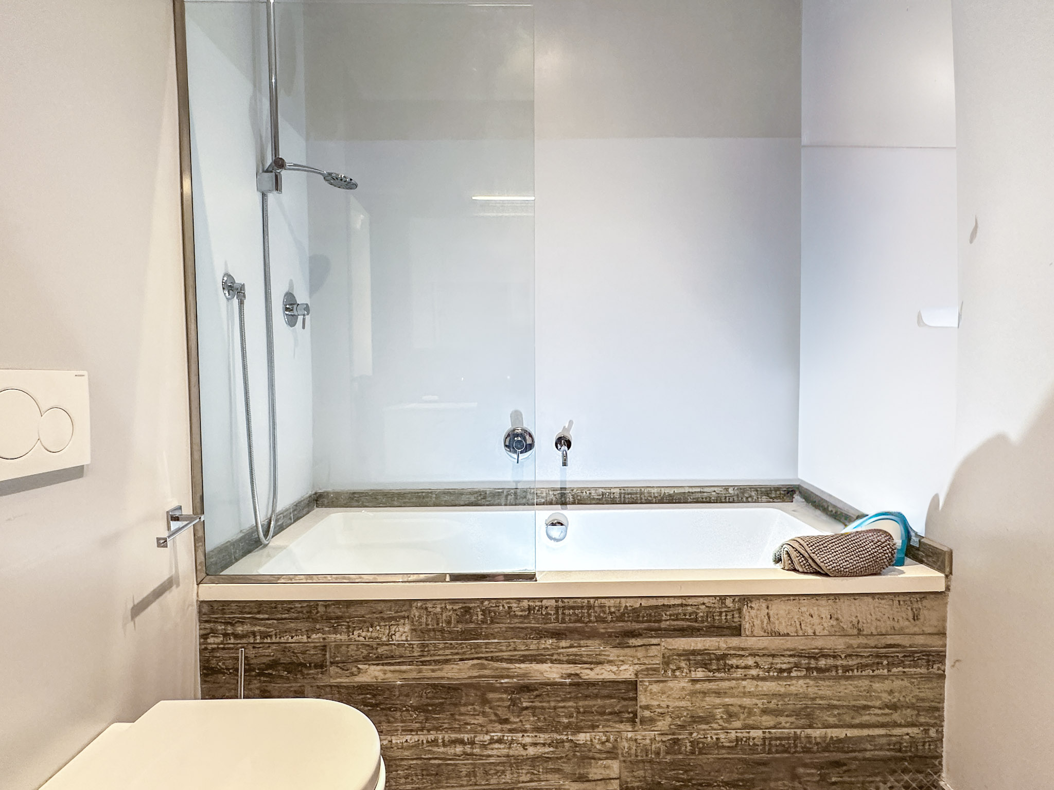 • Bagno con Doccia: Il secondo bagno è provvisto di una doccia walk-in con pareti in vetro temperato, piastrelle effetto pietra e una colonna doccia multifunzione per un’esperienza di benessere quotidiano.