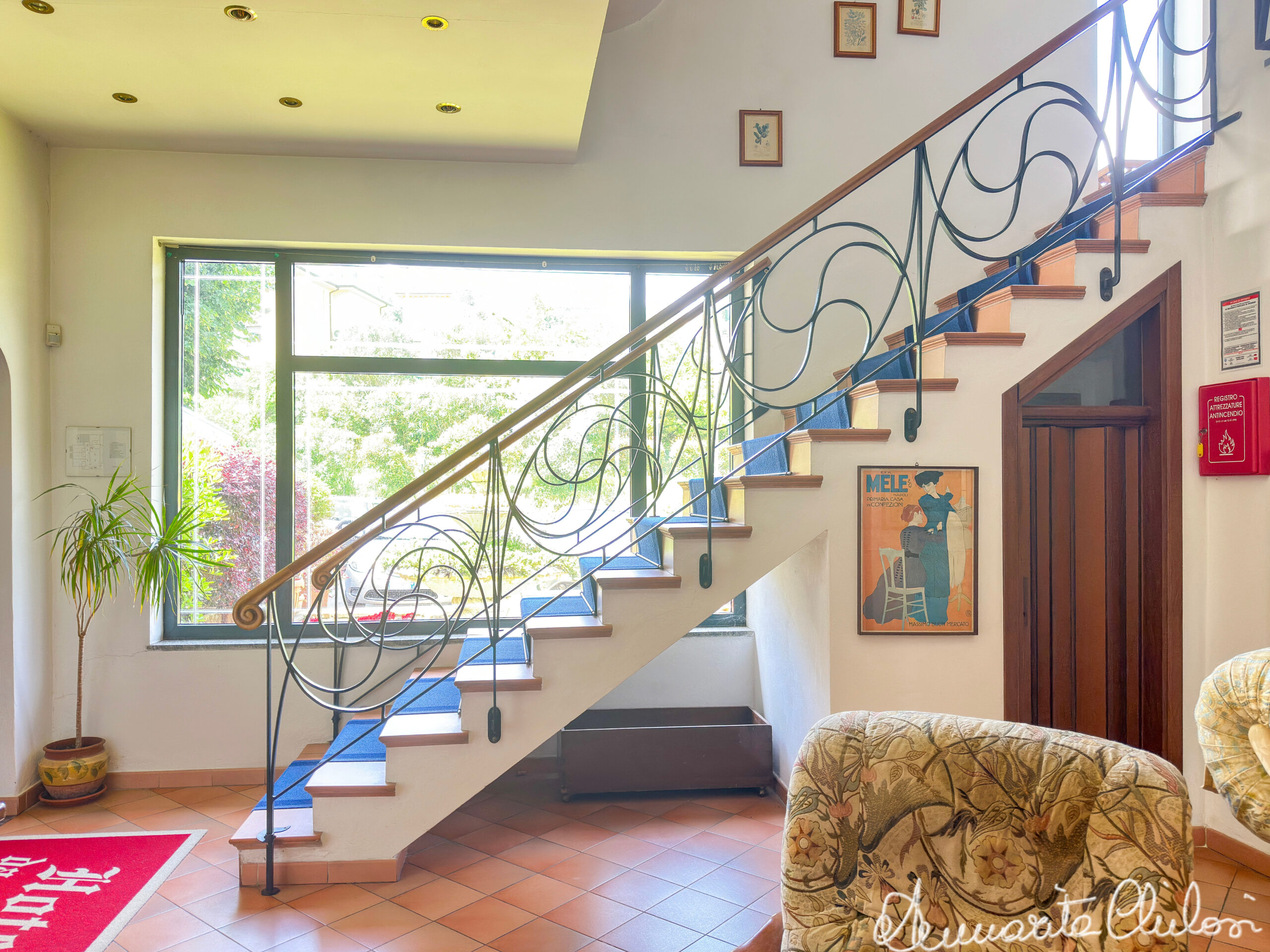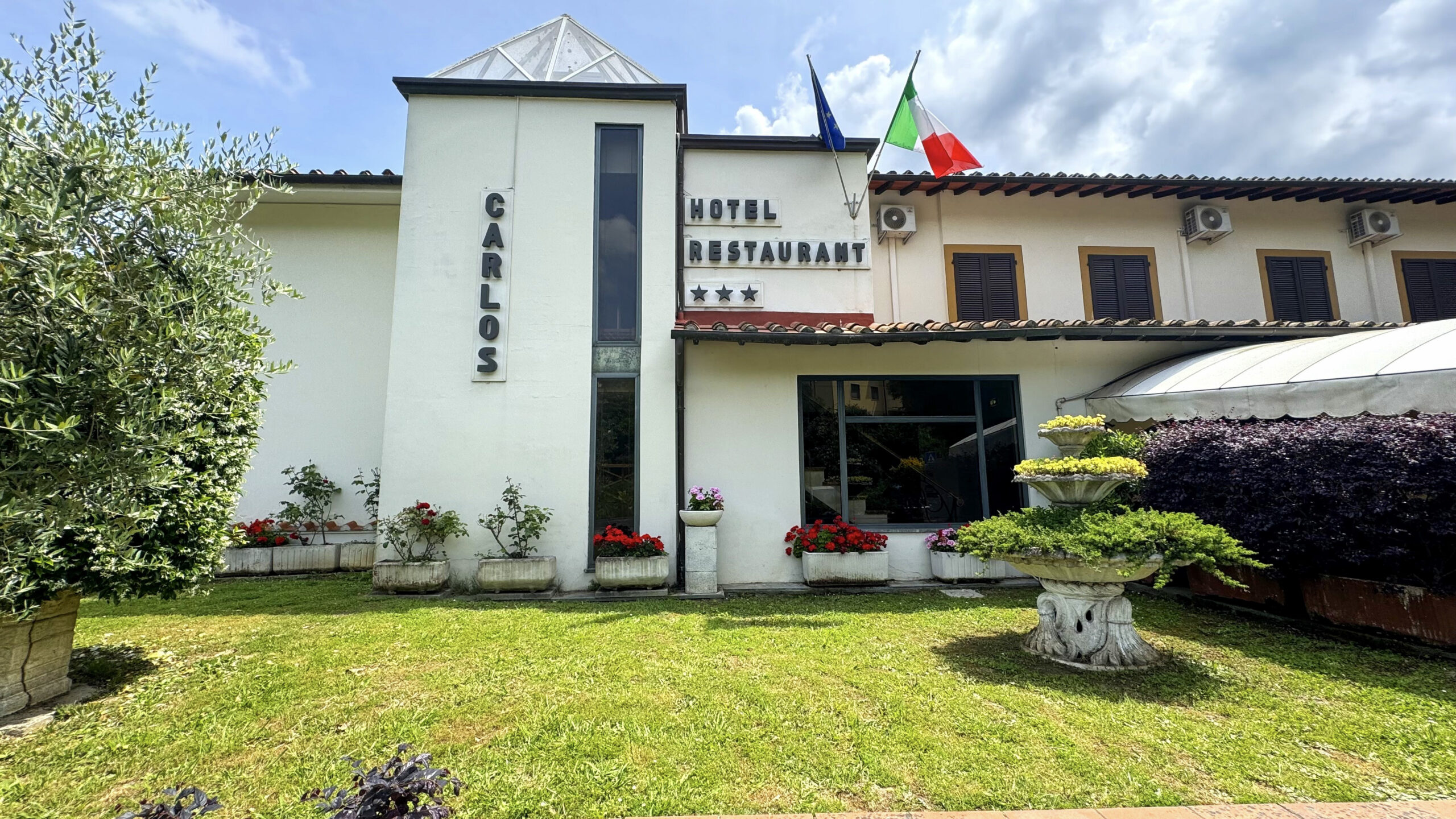 L’Hotel è disposto su piani seminterrato, terra e primo, collegati da un vano scale interno ed uno esterno, entrambi in muratura rivestiti in cotto, e da vano ascensore.